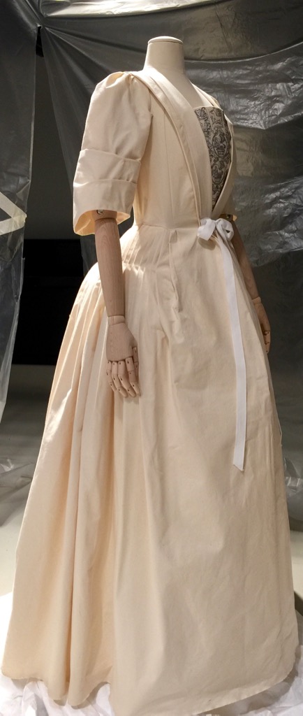 The 1720-1750 wrapping gown, constructed in calico, is based on an original garment held in the collection of the Laing Art Gallery and Museum, Newcastle. It is a curatorial intervention to contextualise the wearing of the stomacher by showing the silhouette of garments worn during the early eighteenth century. However, the embroidery technique and design on the stomacher is from a much earlier period and the textile fragments from which it is constructed suggests it is likely to have been constructed from a gauntlet c. 1600. The outline of the embroidery design on the extant stomacher was traced and stitched in split stitch and stem stitch in charcoal coloured silk thread onto a replica stomacher. More details on the stomacher can be found at Manchester Art Gallery.